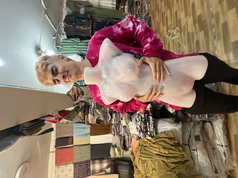A male individual is depicted indoors within a cluttered clothing and textile shop, presumed to be in Rishikesh, India. The individual, appearing to be in his 20s or 30s with short, light-colored (possibly dyed pink or blonde) hair, wears a fuchsia and white tie-dye long-sleeved shirt and black trousers. He holds a white, glossy, plastic female torso mannequin with both hands, positioning it in front of his body from waist to upper chest. The mannequin features rudimentary breasts and a hook attachment at the neck. His facial expression is a slight grimace or smirk, with his eyes partially closed and gaze directed slightly downwards. The background reveals a dense display of merchandise, including patterned shawls and scarves on walls, stacks of folded clothing items, and hanging garments such as patterned shirts and a crochet-style top. A dark armchair and olive-green ruffed garments are visible on the left side of the frame. The shop floor consists of light brown wooden planks, and the white ceiling is equipped with visible light fixtures and a ceiling fan.
