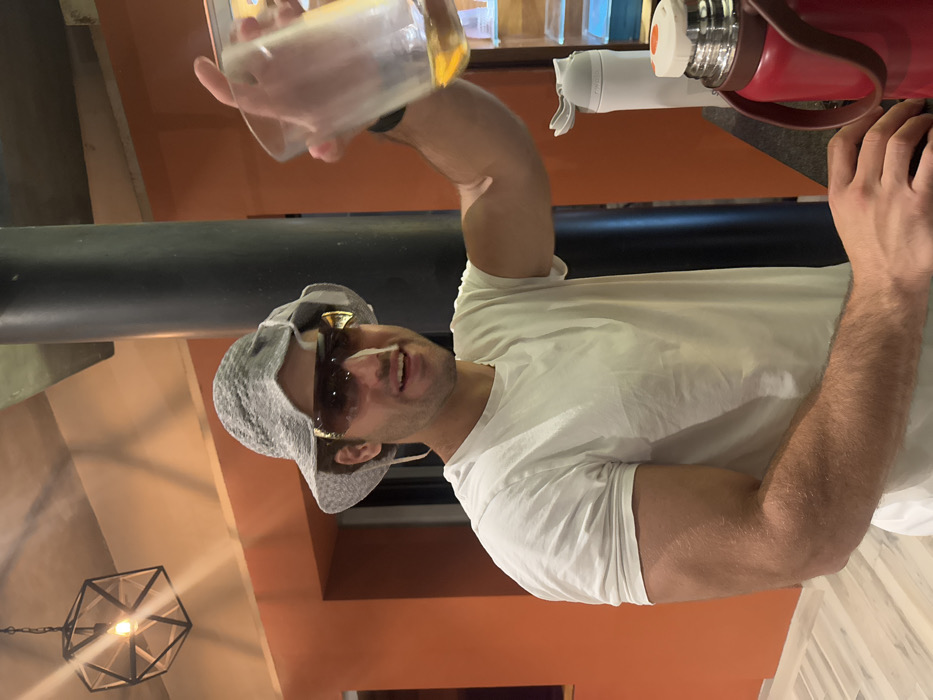 A man wearing a white t-shirt, gray hat, and sunglasses pours liquid from a glass. He's near a black cylindrical object and a red and white bottle. The background includes orange walls, a geometric light fixture, and a glimpse of bottles on a shelf.