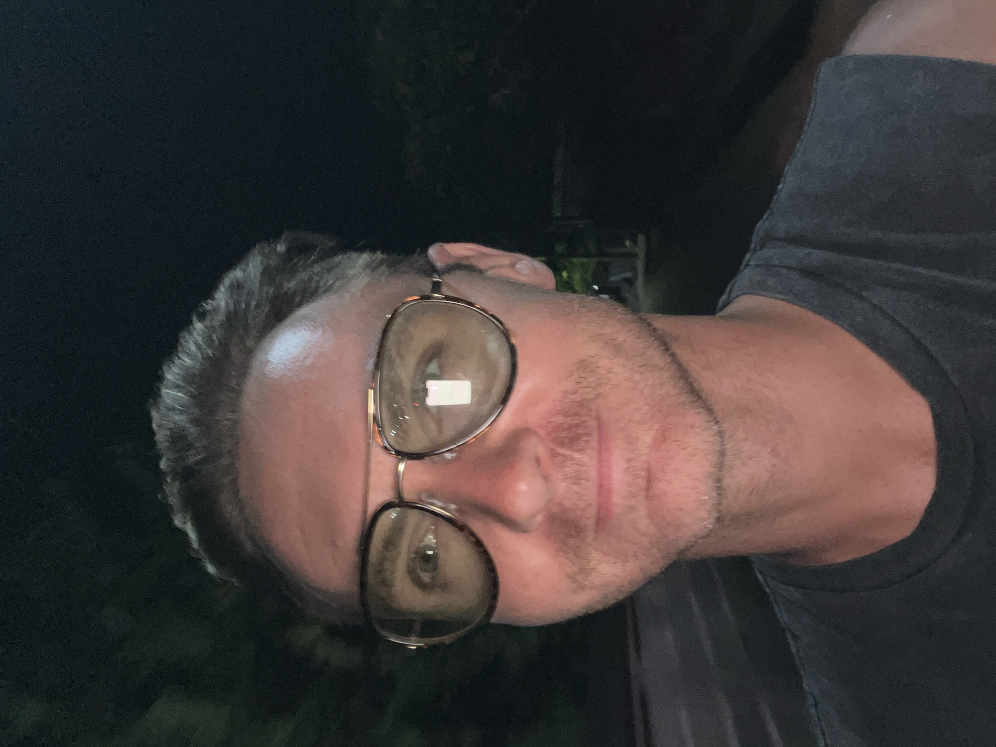 A man with short brown hair and stubble is shown from the neck up, wearing glasses with a brown frame