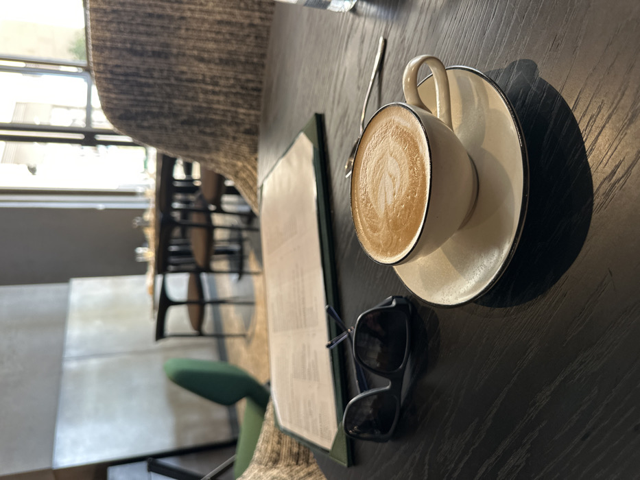 The image displays an interior scene within a restaurant or cafe located in Tivat, Montenegro, viewed from a seated perspective at a dark-colored wooden table. In the foreground, a white ceramic cup containing a latte with a leaf-pattern design in its foam is positioned on a matching saucer, both featuring thin black rims. A silver spoon is visible behind the cup. To the left of the cup, a pair of dark-framed sunglasses with reflective black lenses rests on the table. Further back on the table, an open menu with a dark green cover is visible. The textured, light brown/grey upholstered armrest of a chair is partially visible in the lower-left corner. The background is blurred, showing additional dining tables and chairs, including a distinct green chair and dark-colored upholstered chairs. Large windows or glass doors are visible in the far background, admitting natural light. No individuals are present in the observable scene.