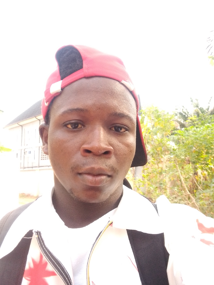 A brightly lit, close-up outdoor photograph depicts a young adult male in the city of Alor, Nigeria