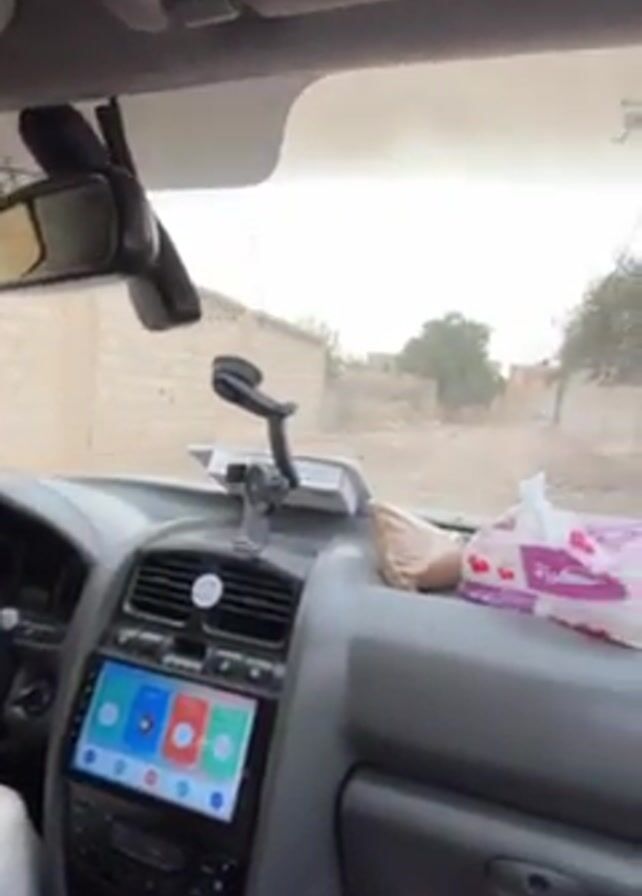 interior of a car driving down a dirt road in what appears to be a Middle Eastern or North African country. The buildings are made of cinder blocks, and there is trash in the street. A mosque minaret towers over the buildings. A person is seen wearing light colored pants and holding a phone. There is a box of tissues on the dashboard.