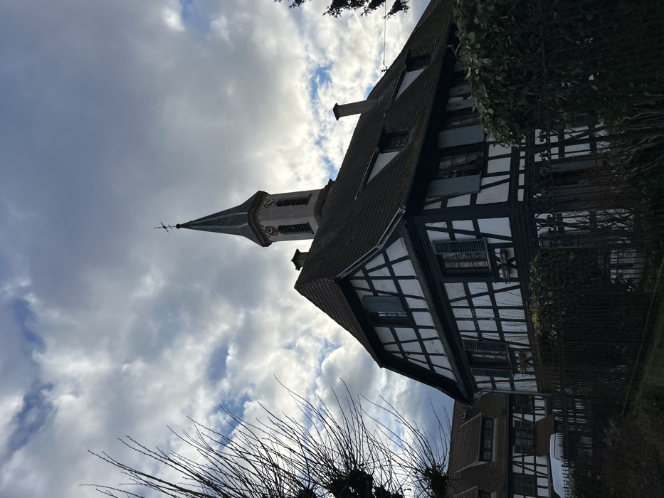 An oblique wide shot captures a historic half-timbered building in Hoenheim, France, under a partially cloudy sky