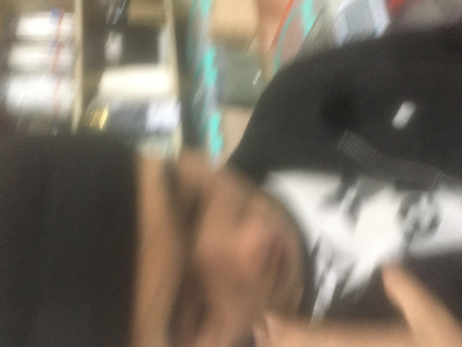A blurry image depicts a person wearing a black shirt with a white patterned design. The person's face is visible but out of focus. A hand is partially visible, with fingers pointing towards the face. The background includes indistinct shapes and colors, possibly shelving or objects within a room. The overall quality of the image is poor due to significant blur.