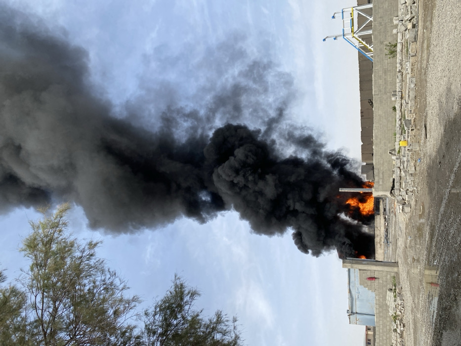 In Khvoshab, Afghanistan, a large, uncontrolled fire is actively burning, emitting a substantial column of dense, black smoke that rises vertically into a partly cloudy sky. Bright orange flames are visible at ground level, originating from a light blue or gray building with a damaged section of wall. To the right of the fire, a series of dark, solid barriers, possibly concrete, stand. Further right in the background, a structure featuring a blue and yellow ladder or staircase is visible. The foreground consists of a dirt and gravel lot exhibiting tire tracks and small puddles, with scattered concrete blocks and debris. A low concrete block wall, presenting an open gate area, separates the foreground from the fire. A red fire extinguisher is mounted on a post immediately to the left of this gate opening. A yellow bucket is visible on the ground to the right of the wall opening. A tree with sparse green foliage partially obstructs the upper left portion of the sky. No individuals are visible within the frame.