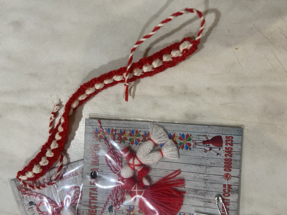 - "The scene depicts multiple traditional Bulgarian martenitsi, arranged on a light-colored, textured surface in Gulyantsi, Bulgaria" by FM-JPbCw2, licensed under CC BY 4.0