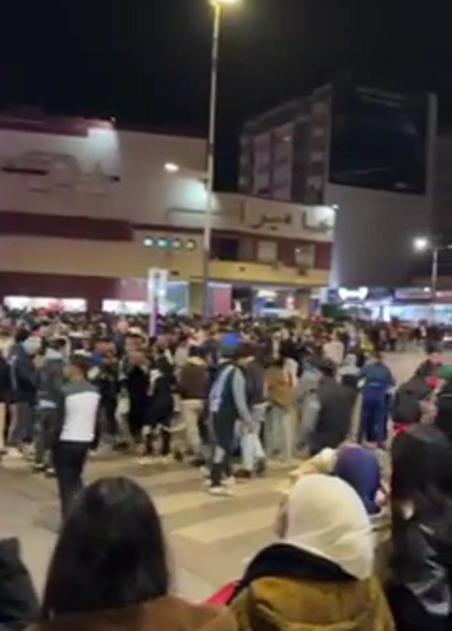 large crowd of people gathered on a city street at night. Many are wearing winter clothing, some are taking photos or videos with their phones. The crowd appears to be on a crosswalk or pedestrian area, with buildings and streetlights visible in the background. The atmosphere appears lively and potentially celebratory, with people standing closely together.