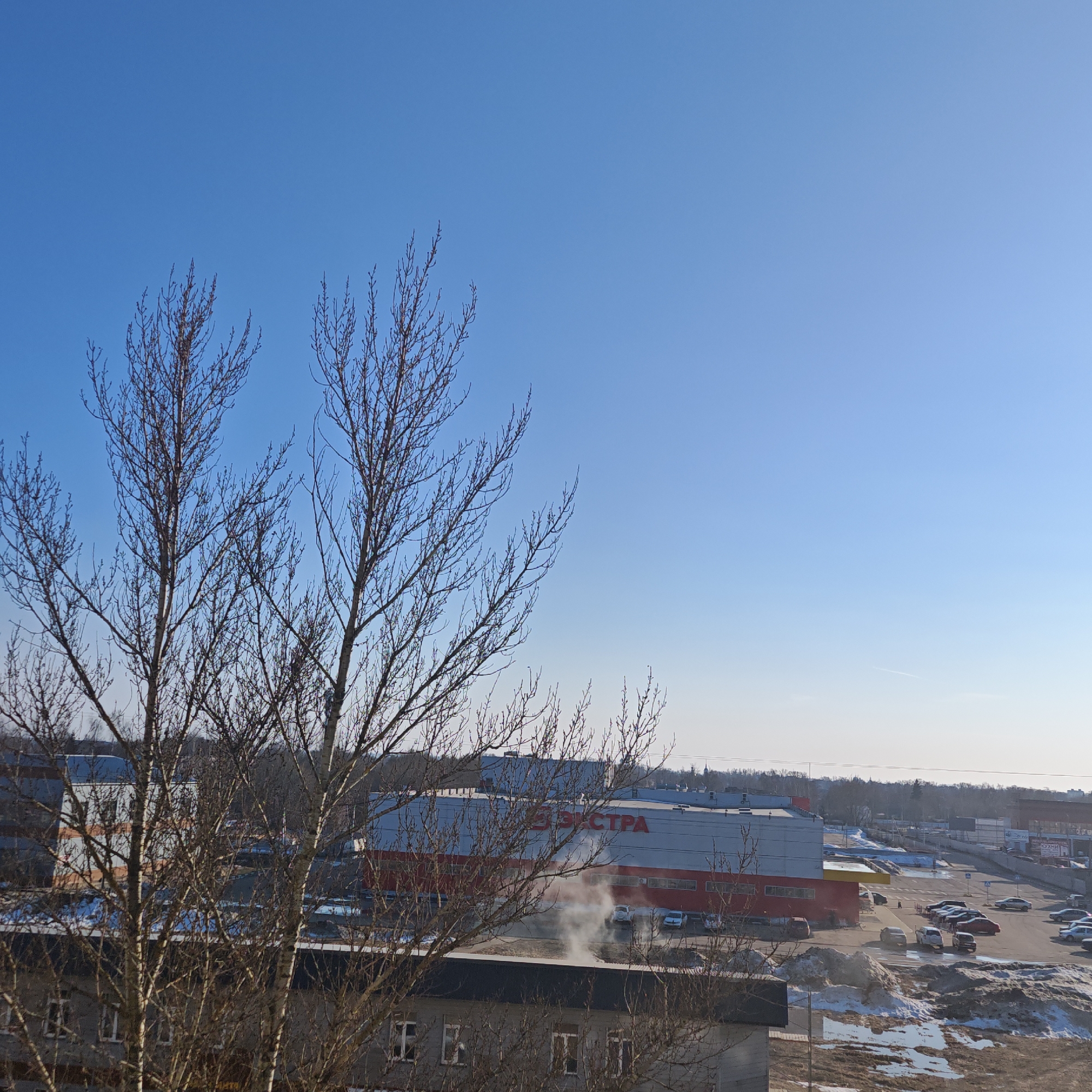 The image captures an urban landscape in Rostov Veliky, Russia, observed during daytime under a clear, blue sky. In the foreground, two bare deciduous trees with visible branches partially obscure the view of a lower, dark-grey building featuring multiple white-framed windows. The midground prominently features a large commercial building with a red lower section and a light-grey upper facade, bearing the prominent red Cyrillic inscription "ЭЛЕКТРА" (ELECTRA). Adjacent to this building is an asphalt parking lot containing numerous parked passenger vehicles. White steam or exhaust is visibly rising from behind a light-colored vehicle positioned in the parking lot, directly in front of the "ЭЛЕКТРА" building. Patches of dirty snow and melted slush are scattered across the parking lot and surrounding ground areas. Additional multi-story buildings and structures are visible further in the midground and background, including one with a dark blue reflective roof. A distant line of bare trees marks the horizon, and a faint aircraft contrail is visible in the upper right quadrant of the clear sky. No individuals are clearly discernible.