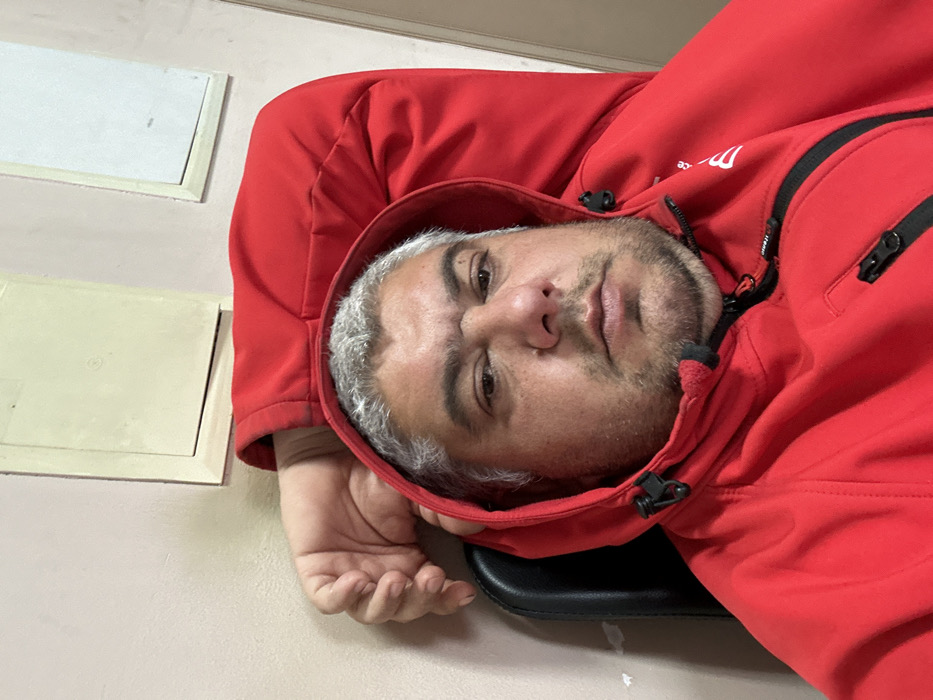 A male subject is depicted in an indoor setting within the city of Byala, Bulgaria. The individual, with salt-and-pepper hair, prominent eyebrows, and stubble, is looking directly at the camera with a neutral expression. He is wearing a red hooded jacket, which features black zippers and drawstring toggles. His right arm is bent, with the hand resting against the wall behind his head, partially obscured by the jacket's hood. He is seated in what appears to be a black chair, a portion of which is visible behind his left shoulder. The background consists of a light-colored, possibly off-white, wall featuring two distinct rectangular, off-white panels embedded or mounted on its surface. The scene is illuminated by consistent, even indoor lighting.