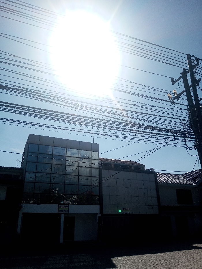 This image depicts an urban street scene in Niz Lakuk, India, under a clear blue sky with intense sunlight emanating from the upper left quadrant. Numerous dark electrical or telecommunication wires traverse horizontally across the upper portion of the frame, converging towards a dark utility pole on the right side, which supports multiple cross arms and insulators. The foreground and midground feature a row of buildings largely obscured by strong shadows due to the overhead sun. On the left, a multi-story building presents a modern facade composed predominantly of dark, reflective glass panels arranged in a grid, reflecting the sky and ambient light. Its ground floor is recessed and heavily shadowed, displaying a partially legible white sign that reads "DI SEWAKAN" (For Rent) along with additional contact details. To the right of the glass-fronted building, another structure exhibits a lighter, possibly textured or tiled, upper facade. Its ground level is similarly engulfed in shadow, featuring a small, distinct green circular light or marker centered on the facade, above a second obscured sign. Above these structures, sections of traditional reddish-brown tiled roofs are visible. The ground surface, visible in the lower right, is paved with light-colored interlocking pavers or bricks. No individuals or active subjects are discernible within the frame.