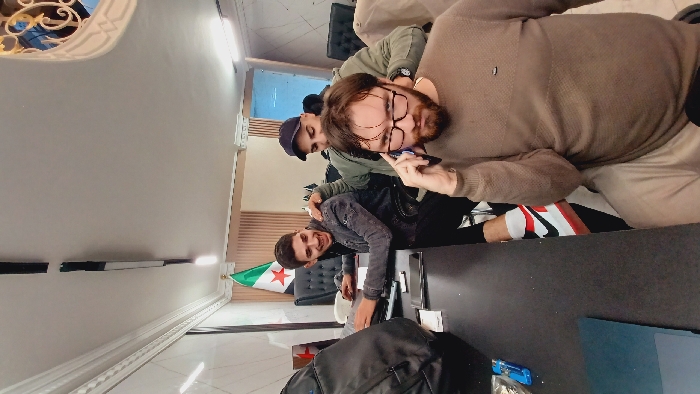 The image displays three adult males interacting within an office environment located in Al-Midan Municipality, Syria