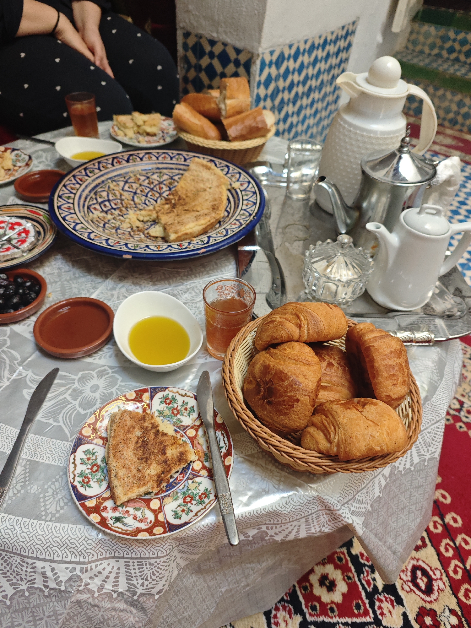 The image depicts a breakfast scene in Fez, Morocco. A table is set with a variety of Moroccan breakfast items, including croissants in a wicker basket, bread, olives, a small bowl of oil, what appear to be Moroccan pancakes (Msemen) on traditional ceramic plates, and glasses of tea. There are tea kettles and a sugar bowl present. A person is partially visible in the upper left, seated at the table. The table is covered with a tablecloth, and a carpet with a traditional Moroccan design is visible beneath the table. The background features tiled walls with geometric patterns, characteristic of Moroccan architecture in Fez.