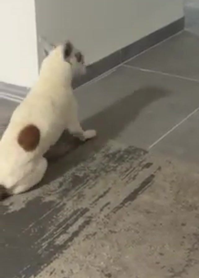 A small, white dog with brown spots on its head and back is seen in an indoor setting. The dog initially rolls on its back, then stands up and looks around, wagging its tail. The floor is tiled in shades of gray, and there is a white wall in the background.