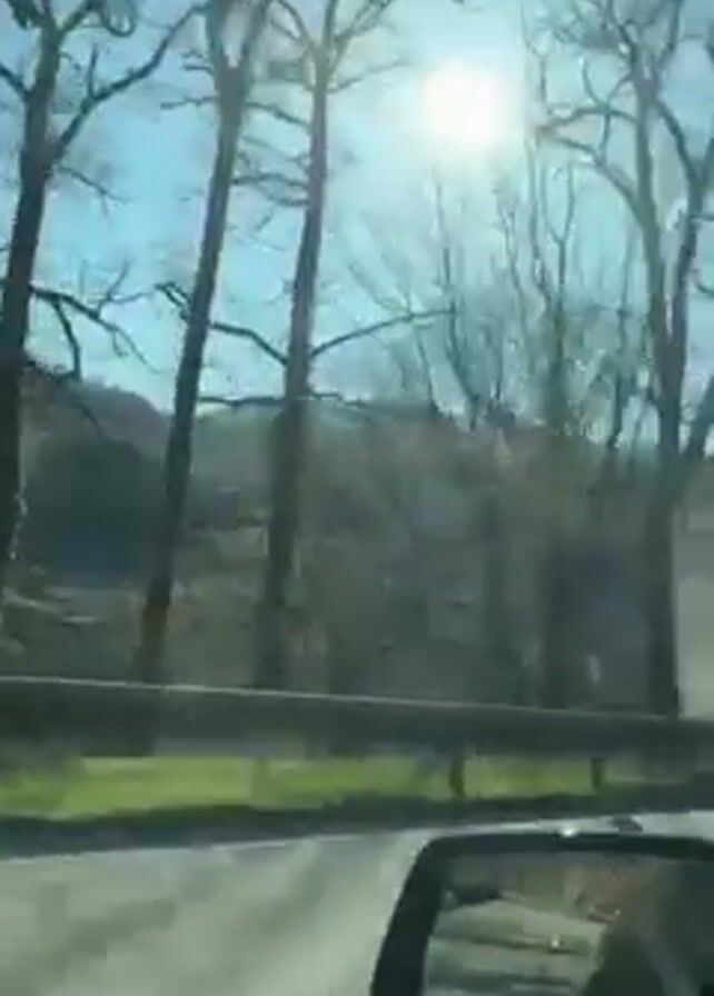 A first-person perspective video shows a car driving on a winding road. The sky is blue with the sun shining through the trees. The trees are mostly bare, suggesting it may be late winter or early spring. On the left side of the road, there's a green hillside. The road is asphalt with white lines marking the lanes. A guardrail is visible on the side of the road. The landscape appears to be hilly or mountainous in the distance.