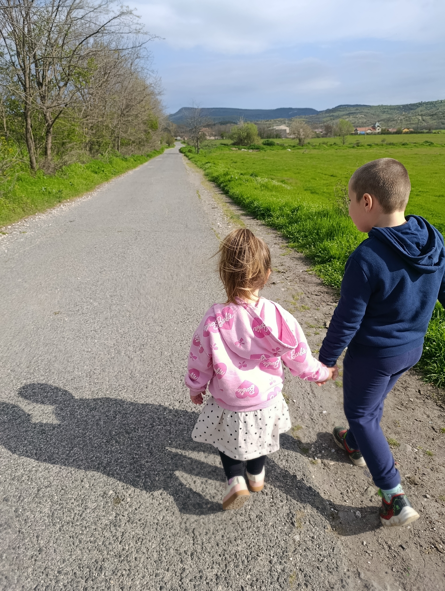 Two children, a boy and a girl, are walking hand-in-hand down a paved road. The boy is wearing a navy blue hoodie and pants, and sneakers with red and green accents. The girl is wearing a pink hoodie with Barbie logos, a white polka-dot skirt, dark leggings, and pink shoes. The road is bordered on the left by trees and on the right by a green field. In the background, there are rolling hills and a few buildings. The location is in Shiroko pole, Bulgaria. The sun is casting shadows of the children to the left of the road.