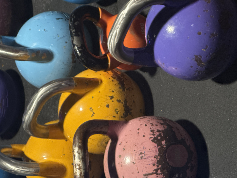 A close-up shows a collection of kettlebells stacked closely together
