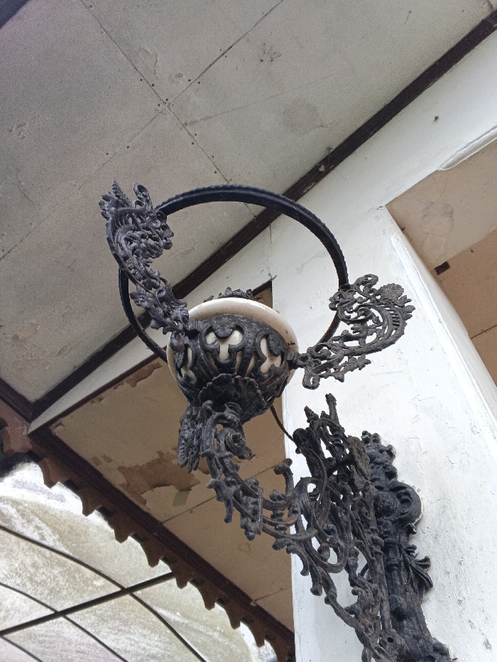 - "An upward-angled photograph depicts an ornate, dark-colored, cast iron wall-mounted light fixture attached to an off-white architectural column or wall in Akshatau, Kazakhstan" by FM-VCndm1, licensed under CC BY 4.0