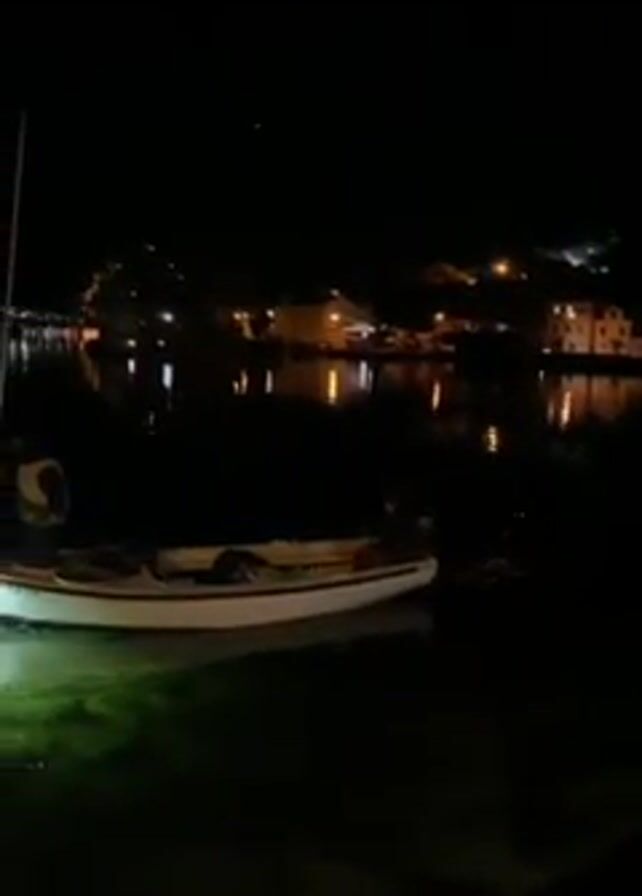 At night, a stationary white boat with a mast stands in a calm body of water, possibly a bay or harbor