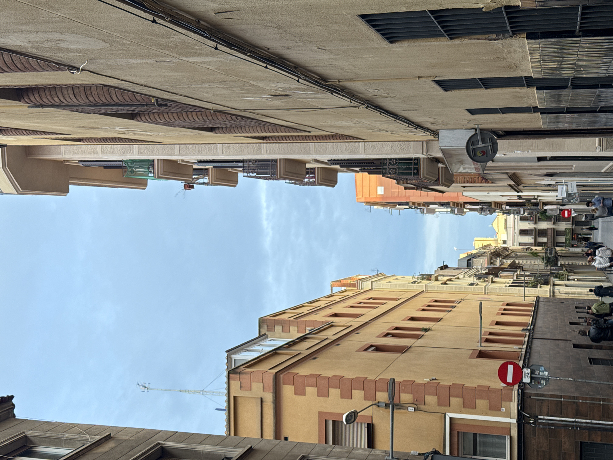 The image captures a street view in Barcelona, Spain, looking upwards between two buildings