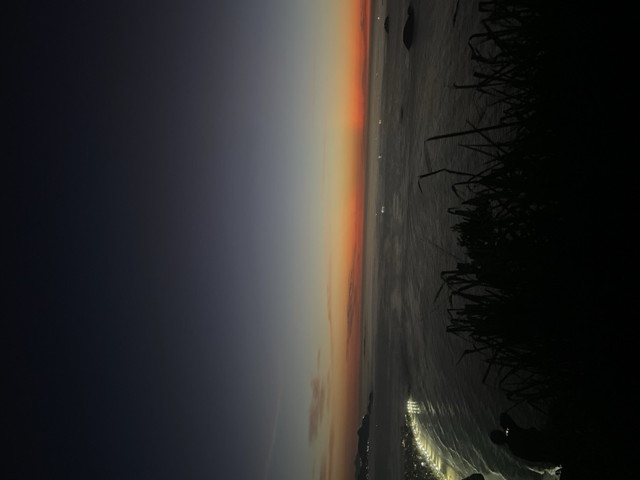 A vertical landscape reveals a horizon ablaze with an orange-red sunset gradient. To the left, the sky darkens to a deep navy, contrasting with the vibrant horizon. To the right, an ocean stretches out, reflecting the fading light. Silhouetted grasses and vegetation fill the foreground, obscuring a cityscape with twinkling lights along the shoreline. A silhouette of a person can be discerned amidst the darkness, possibly enjoying the scenic view.