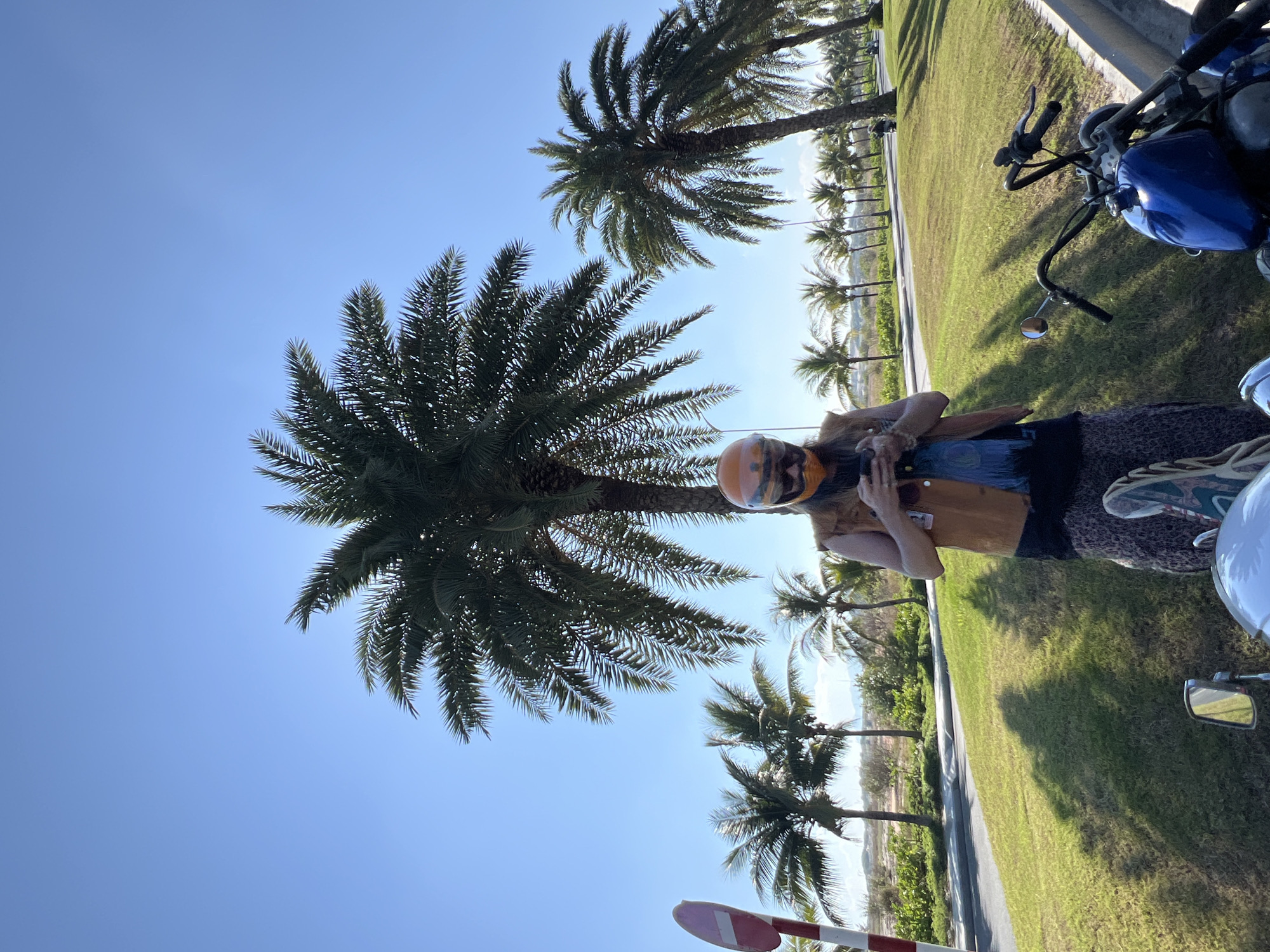 An individual is depicted standing outdoors under a clear blue sky in Cam Ranh, Vietnam. The person, positioned slightly left of center, is wearing an orange full-face motorcycle helmet, a brown sleeveless vest over a dark shirt, patterned trousers, and a blue scarf, while actively using a smartphone held with both hands. A motorcycle is partially visible in the immediate foreground, with a blue fuel tank and black handlebars on the right, and a white portion with a chrome mirror on the left. The scene is set on a grassy verge beside a paved road, which curves to the right and is lined extensively with numerous tall palm trees. A red and white striped pole is visible on the far left. Strong sunlight casts distinct shadows across the green grass. Another motorcycle is observed in the distance on the paved road, moving away from the viewer.