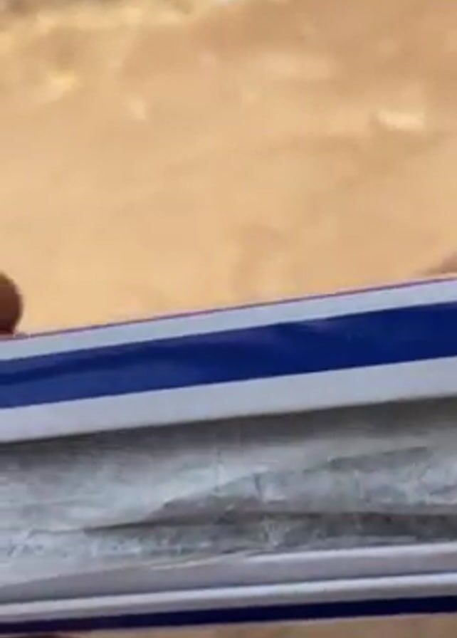 opening of a box labeled "HARMONICA." The box is white with blue and purple accents. Inside the box, a harmonica is wrapped in crumpled white tissue paper. The background is out of focus, showing a blurry landscape with a light brown surface. A hand is visible holding the box.