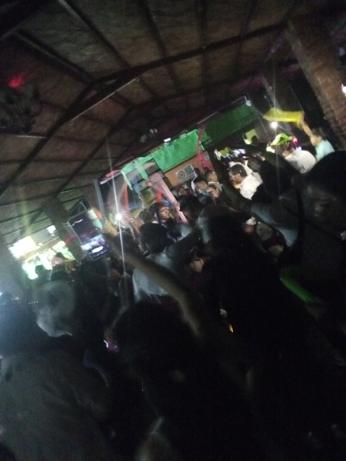 A dimly lit, crowded indoor space. People are gathered, some holding up phones or objects, possibly at a concert or event. The ceiling has a rough, thatched appearance. Green equipment or structures are visible in the background. The overall impression is of a lively, possibly chaotic, gathering of people in a low-light setting.