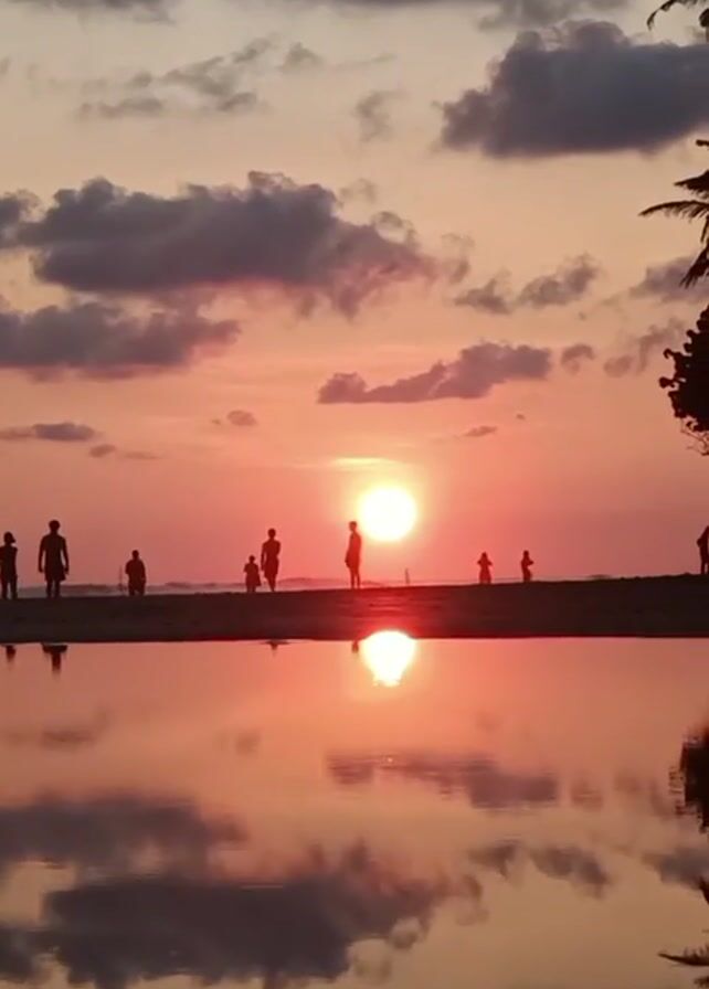 sunset at a beach with several people silhouetted against the bright setting sun. The sky is filled with clouds tinged with orange and pink. A body of water reflects the sunset and the clouds. Palm trees are visible on the right side of the frame. People are walking on the beach.