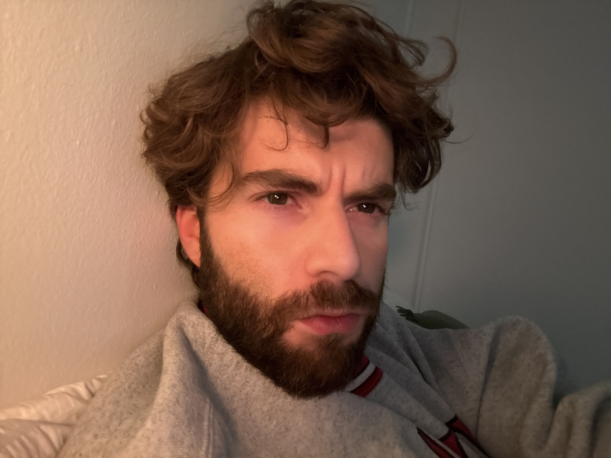 A close-up, indoor selfie shows a fair-skinned man with brown hair and a beard. He has a furrowed brow and a slightly frowning expression. He is wearing a gray sweatshirt with red and white trim around the neck. The background consists of a white wall on the left and a gray wall on the right. The location is indeterminate as there are no elements visible that would specifically place it in Montreal, Canada.