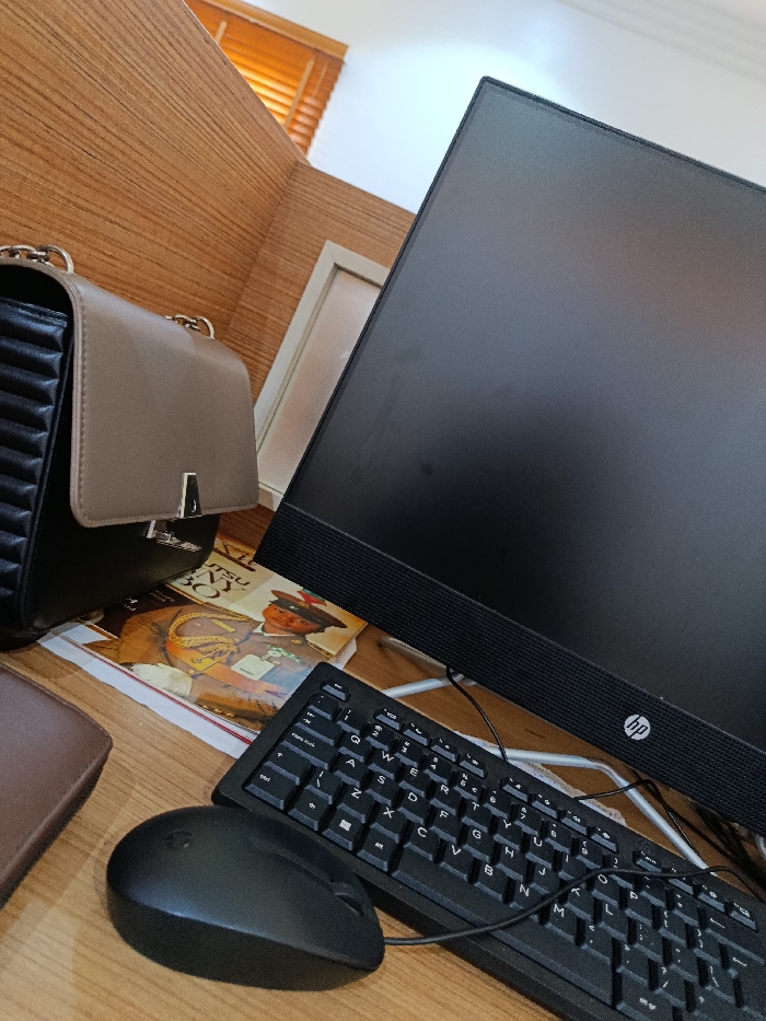The scene depicts a desk area within the Immigration Quarters, Nigeria. A light-brown wooden desk surface holds a black HP computer monitor, a black wired QWERTY keyboard, and a black wired optical mouse. The monitor screen is dark and exhibits surface smudges. To the left of the monitor, a black quilted and tan-colored structured handbag with a metal clasp and chain strap rests on the desk. Partially obscured beneath the handbag and monitor, an open book or magazine displays a color image of a man in military-style uniform with a red-plumed hat. A brown wallet or pouch is partially visible in the lower-left foreground. The background features a wall covered in textured brown wooden paneling, above which a white wall section with visible wooden venetian blinds is present. A white, empty picture frame leans against the wall behind the monitor and handbag. No individuals are present in the image.