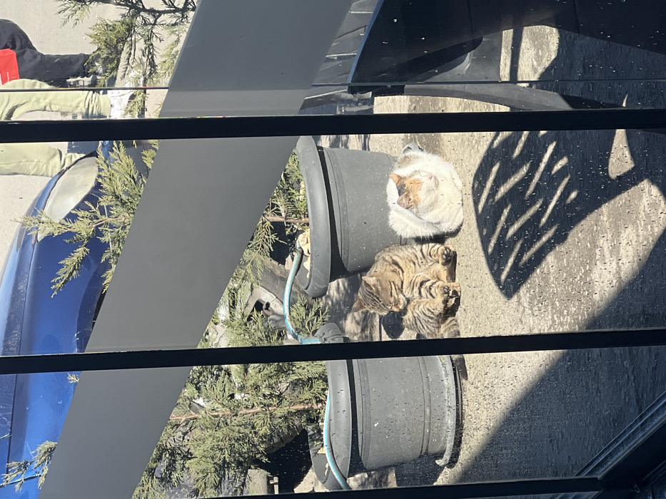 The image depicts an outdoor scene viewed through a glass panel with opaque horizontal white stripes and vertical black dividers. The view is focused on two cats resting on a paved surface, illuminated by direct sunlight which casts distinct shadows. The cat on the left is a tabby, primarily brown with darker stripes, sitting upright with its eyes closed. Its front paws are tucked beneath it. The cat on the right is a calico, predominantly white with patches of orange/ginger and brown, curled into a compact 'loaf' position, also with its eyes closed. Both cats appear to be resting. Behind the cats are two dark grey or black plastic planters, each containing a small evergreen shrub or conifer. A light blue hose is visible near the base of the left planter, and small stones are present on the soil surface within both planters. In the upper background, the front portion of a blue vehicle, likely a car, is visible on the left. Partially visible human legs, one pair in light-colored trousers and white shoes, and another in dark trousers, are present in the upper right background, suggesting human activity nearby. The ground is a light-colored paved or concrete surface. The glass panel exhibits small speckles and streaks. This scene is located in the city of Ruse, Bulgaria.