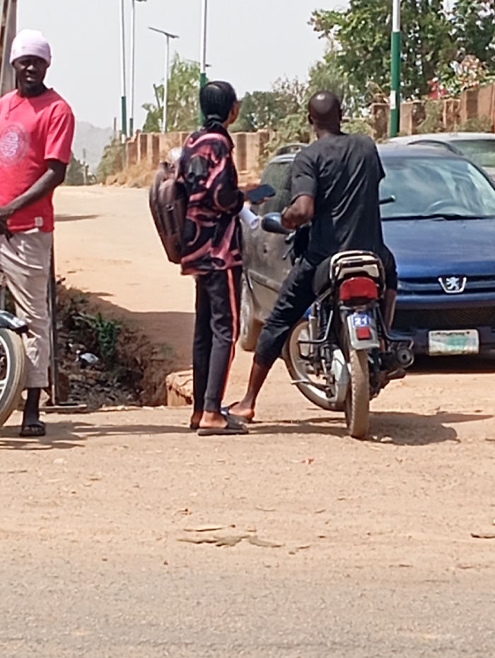 Three males are present on a dusty, unpaved road in Unknown, Unknown, under bright daylight