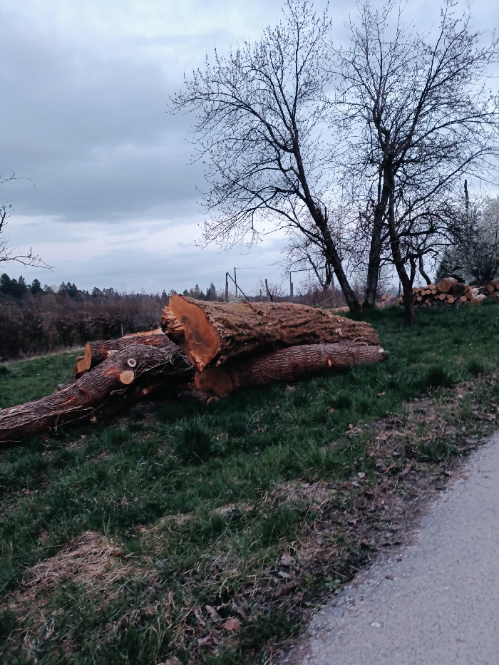 An outdoor scene depicts a rural or semi-rural area under an overcast sky, likely on the periphery of Ljubljana, Slovenia. In the foreground, a large, freshly cut log with exposed orange-brown wood rests on green grass, partially obscuring other smaller logs. The ground exhibits patches of green grass interspersed with drier, light brown vegetation. To the right, a grey paved surface, resembling an asphalt road or path, borders the grassy area. In the midground, several tall, bare deciduous trees with intricate branch networks stand against the cloudy sky. Further to the right, beneath these trees, a stack of neatly cut smaller logs is visible. The background features a dense line of bare trees or bushes, suggesting a wooded area or forest. Two dark, vertical pole-like structures are present in the mid-distance, near the treeline. No people or active interactions are observed in the scene. The bare trees indicate a late autumn, winter, or early spring season. The precise location within Ljubljana is not discernible from specific landmarks; however, the presence of felled timber and a wooded area suggests an outlying district or area bordering natural landscape.