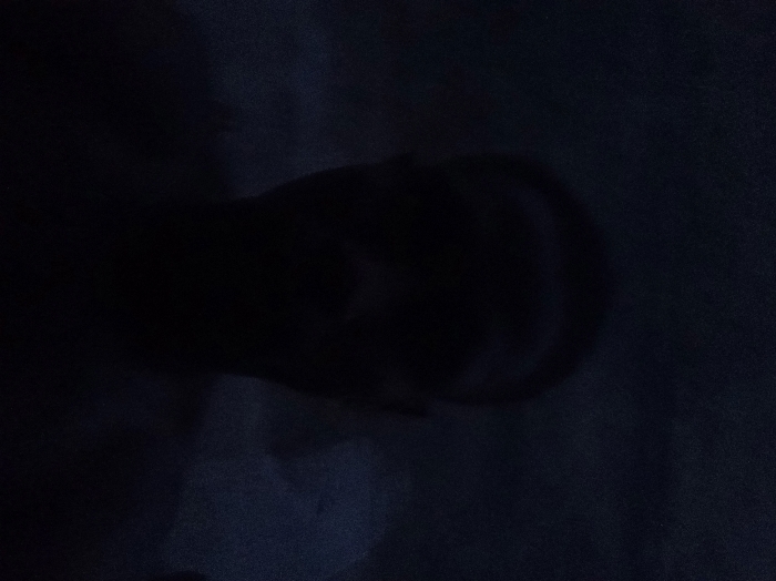 A blurred and dark image reveals a vague shape, possibly an object with rounded edges. The low lighting and lack of detail make it difficult to discern the exact nature of the form. There is a suggestion of a circular element within the larger shape. The background is a textured, possibly fabric surface, and the entire scene is cast in deep shadows.