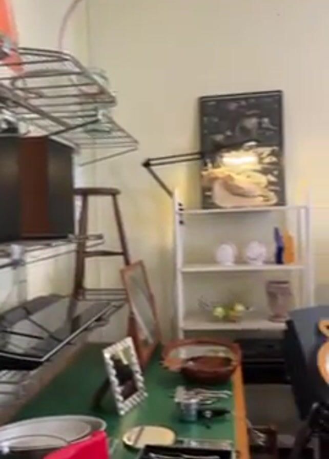 interior of a shop or store, possibly an antique shop or a store with eclectic items. The space is filled with a variety of objects, including furniture, mirrors, artwork, dishes, lamps, and decorative items. There are tables and shelves displaying the merchandise. There is also a section of the store separated by a glass partition. The items are arranged in a somewhat cluttered manner, suggesting a diverse and possibly vintage or second-hand inventory.
