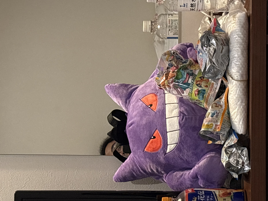 This image depicts an indoor scene in Kyoto, Japan. A large, purple Gengar plush toy, approximately 24 inches tall, featuring embroidered red eyes and a wide white-toothed grin, dominates the center foreground. Resting on the plush toy's lap is a clear plastic bag containing multiple small Pokémon figures, including Bulbasaur, Ivysaur, and Venusaur, with "ポケモンキッズDX" printed in Japanese on the packaging. Around the base of the Gengar plush and on the surface in front of it are several crumpled foil and plastic snack wrappers. To the immediate left, a brown plastic bottle with a white label, displaying "花伝" (Kaden) in Japanese, is partially visible. To the right, two clear plastic bottles of water are present; one clearly shows "天然水" (Natural Water) and an "L" logo on its label. All items are arranged on a dark brown, polished surface, likely a table or counter. The background consists of a plain, light beige wall. In the upper left quadrant, a mirror reflects the top of a person's head, revealing dark, wavy hair, dark-rimmed glasses, and a black strap, consistent with a person standing or sitting nearby, possibly the photographer.