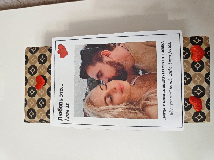 A Valentine's Day card rests between two decorated bars. The card features a photo of a couple in an intimate embrace, with text in Russian and English: "Love is... when you can't breathe without your person." The bars are adorned with a brown and black circular pattern, each embellished with a small red heart. The card is positioned on a clean, white surface.