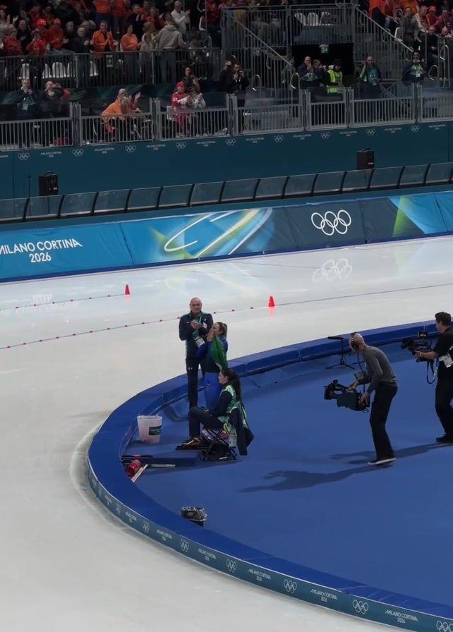 A high-angle shot shows an Italian ice skater wrapped in an Italian flag posing for photos on a blue platform at an ice skating arena