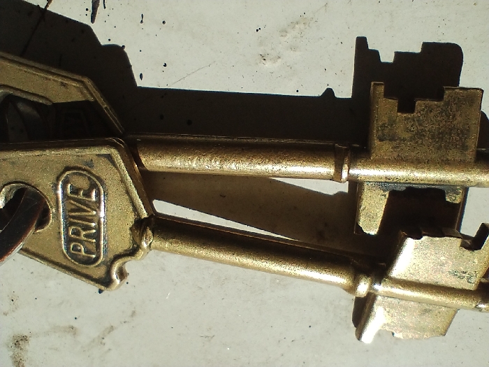 A close-up, high-angle photographic depiction shows two brass-toned metal keys resting on a light-colored, textured surface. Both keys are connected by a dark metal split ring, partially visible at the top edge. The head of the leftmost key is prominently embossed with the word "PRIVE" in capital letters within an oval border. Both keys exhibit a worn, slightly irregular patina characteristic of aged brass or a similar alloy, with areas of direct specular reflection from an overhead light source. Their shafts are cylindrical, transitioning to distinct, complex multi-bitted tips. Sharp, elongated shadows extend to the lower right of both keys, indicating strong, directional illumination originating from the upper left. The underlying surface is light-colored, possibly off-white, and shows minor dark specks and subtle textural variations. No individuals or active interactions are present within the frame. The scene is depicted in Godoy Cruz, Argentina.