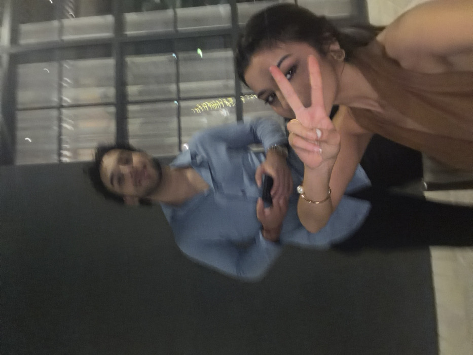 The image depicts two individuals indoors during what appears to be an evening or nighttime setting. The specific location within the city of Miami, United States of America, is not discernible from the visual elements present in the image. In the foreground, a female subject is partially visible, oriented towards the camera. She has dark hair and is wearing a dark, possibly brown or bronze, strapless or halter-neck top. Her right hand is raised, forming a "peace" sign (V-sign) with her index and middle fingers extended. A gold-colored bracelet featuring a single white pearl is visible on her right wrist, and her fingernails are painted white. Her face is partially obscured by her hand and exhibits blur, but her mouth appears upturned, consistent with a smile. Behind and slightly to the left of the female, a male subject is standing. He has dark, curly hair and facial stubble or a short beard. He is wearing a light blue, long-sleeved button-down shirt with an open collar and dark trousers. He holds a dark-colored smartphone with both hands clasped in front of him. A watch is visible on his left wrist. His face is blurry, but he appears to be looking towards the camera with a smile. The background consists of a dark, plain wall on the left side and a large window with multiple panes on the right side. Through the window, out-of-focus lights, consistent with an urban environment at night, are discernible. The overall image exhibits blur, indicating low light conditions or motion during capture.