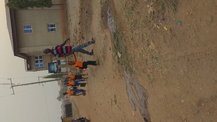A group of children wearing matching orange shirts and blue pants are walking along a dirt road, holding hands. One man in a striped shirt and jeans is holding the hand of a child in an orange shirt. A building with blue-tinted windows is visible in the background, along with a tall, thin tree. Power lines are visible in the sky. The road is uneven and dirty, with scattered debris.