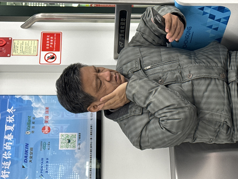 An Asian man with salt and pepper hair sleeps with his cheek resting on his hand on a train or bus. He wears a quilted grey jacket and holds a phone. Behind him are advertisements for various brands like Daikin, Vaillant, Rheem, and Pentair. One sticker reads "For emergency use only," and another reads "Jiangtiao Line welcomes you" in Chinese and the city of "Chongqing".