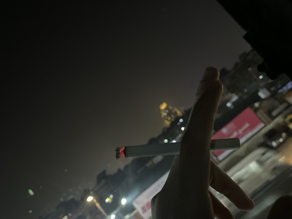 A person holds a lit cigarette at night with a blurry cityscape backdrop