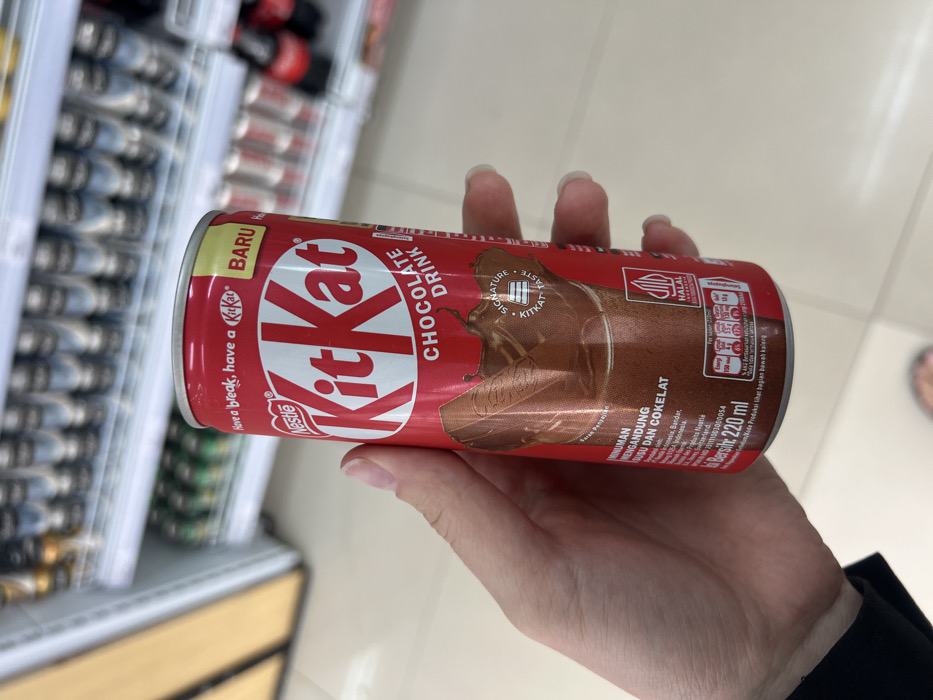 The scene is set inside a retail establishment in Munggu, Indonesia. A light-skinned hand, likely belonging to an adult, is holding a red aluminum can of Kit Kat Chocolate Drink. The can is primarily red with the white "Nestle" logo and large "Kit Kat" branding. Text on the can reads "CHOCOLATE DRINK," "Have a break, have a Kit Kat," and "BARU" (New) on a yellow banner. An illustration on the can depicts chocolate liquid and a Kit Kat wafer, with "SIGNATURE KITKAT TASTE" noted. Visible information includes the volume "220 ml," nutritional facts, and a "HALAL INDONESIA" certification logo. The background is blurred, showing white metal shelving units fully stocked with rows of various canned beverages, including silver/grey, green, and red cans. A light-colored tiled floor is visible, and a wooden display element is partially visible on the far left.