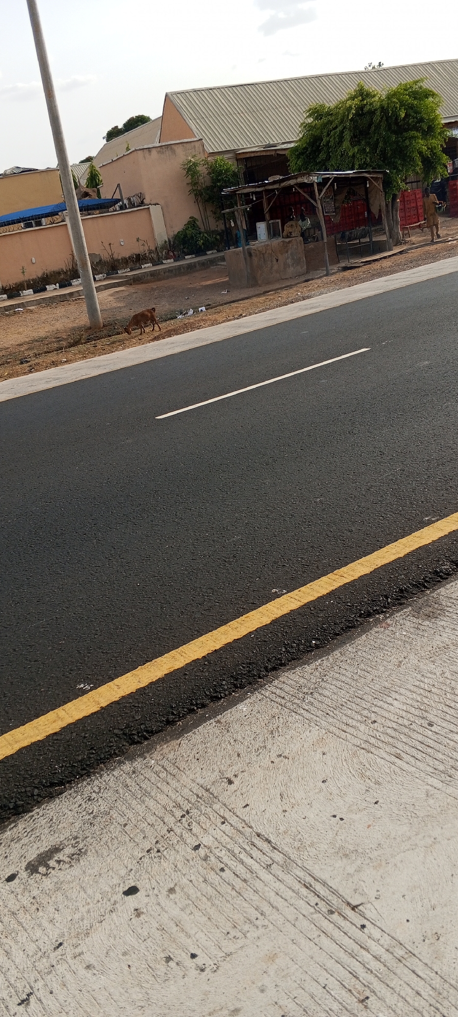 The image captures a street scene in Keffi, Nigeria. A freshly paved asphalt road is prominently displayed, marked with a solid yellow line along the right edge and a dashed white line in the center. A goat grazes on the shoulder of the road, adjacent to a concrete curb and sidewalk. In the background, low buildings are visible, one with a corrugated metal roof. A small, makeshift roadside stall is partially shaded by a tree. A lone figure stands near the stall, possibly a vendor or customer. A utility pole stands to the left of the road. The sky is overcast, providing soft, diffused light. The street appears clean, with minimal litter visible on the roadside.