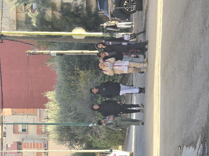A group of seven people stands near a road. The group is composed of mostly young adults, possibly students or teenagers. Most of them wear dark clothing, with one person in a tan jacket. They stand on the edge of a paved road next to a line of trees or bushes. A car and other vehicles are visible in the background. The sky is bright, suggesting a daytime setting.