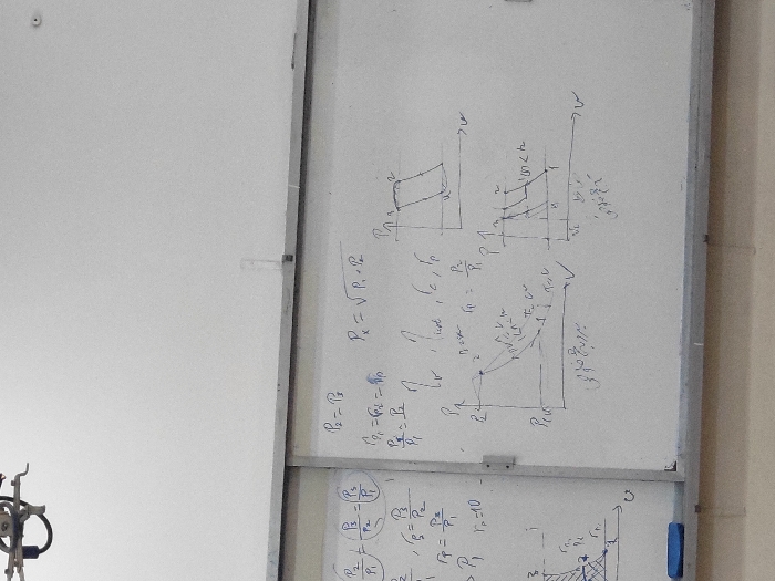 The image displays an indoor educational environment within Ash-Shaghour Municipality, Syria, primarily featuring two whiteboards covered with scientific content. The dominant object is a large white whiteboard occupying the center and right, extensively marked with blue handwritten equations and thermodynamic diagrams. Notable equations include "P2 = P3" and "Px = √(P1 * P2)", along with several expressions involving pressure ratios (P1, P2, P3). Multiple cycle diagrams are drawn, resembling Pressure-Volume (P-V) or Temperature-Entropy (T-S) charts, detailing processes with labeled states (1, 2, 3, 4) and directional arrows, indicative of heat engine or refrigeration cycles. Some Arabic script is integrated with these diagrams, likely serving as labels or explanatory notes. To the left, a portion of a second, narrower whiteboard is visible, also containing blue handwritten mathematical equations, including pressure ratios (P2/P1, P3/P2) and the term "rp=10". This board also features a P-V diagram with a shaded area, commonly representing work. A blue rectangular whiteboard eraser rests on the bottom ledge of this left whiteboard. Above the left whiteboard, a metallic laboratory clamp or stand apparatus is partially visible, suspended from the ceiling or an upper mounting point. The wall above the whiteboards is plain white, and a dark brown or wooden surface forms the bottom edge of the frame, possibly a desk or wall trim. No individuals are present in the scene. The content on the whiteboards suggests a focus on engineering thermodynamics or related physical sciences.