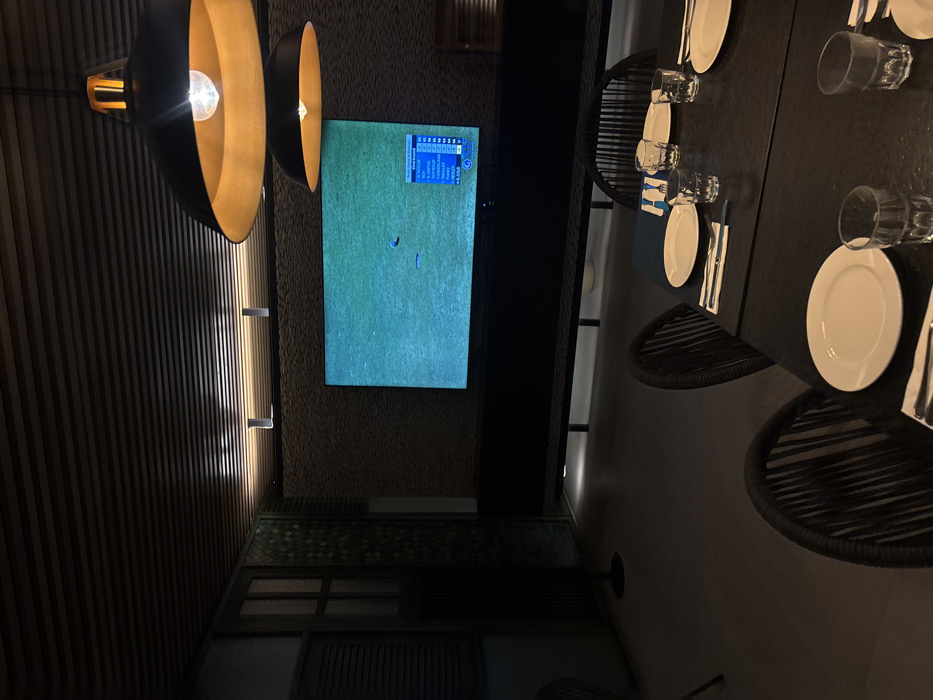 A modern dining area features a dark wood table set with white plates, glasses, and cutlery. Wicker-style chairs surround the table. A television screen displays a golf broadcast, positioned between the table and a wall with vertical wood panels. Two pendant lights with gold interiors hang above. A lower section of the wall includes a window or decorative panel.