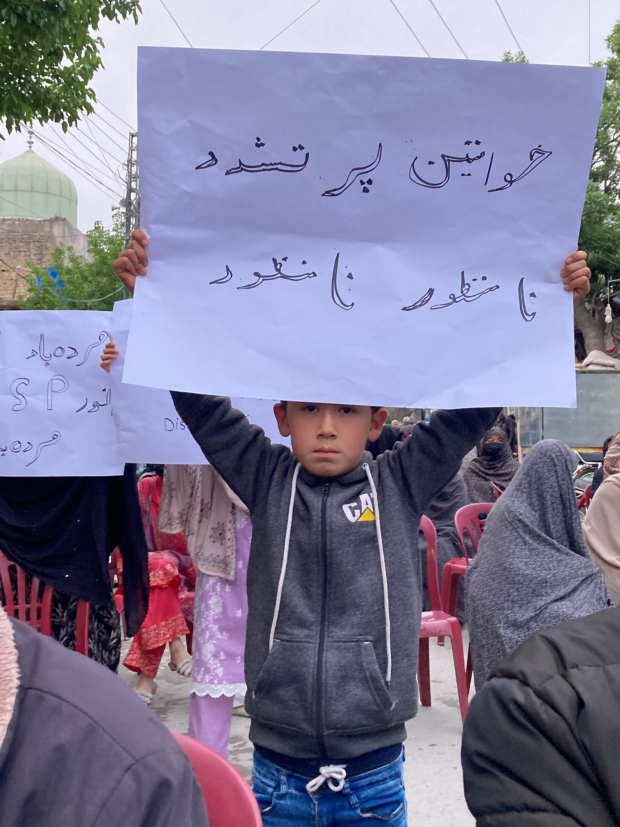 A young boy is holding a sign with text written in Urdu or Pashto in a photograph apparently taken in Quetta, Pakistan. The text on his sign appears to read "khawatin par tashaddud na manzoor", which translates to "Violence against women not acceptable". Other people sit in chairs, some wearing face coverings and others holding signs, suggesting a public gathering or protest. In the background, a mosque or religious building is visible. The setting suggests an outdoor location, possibly a public square or gathering space in an urban area.