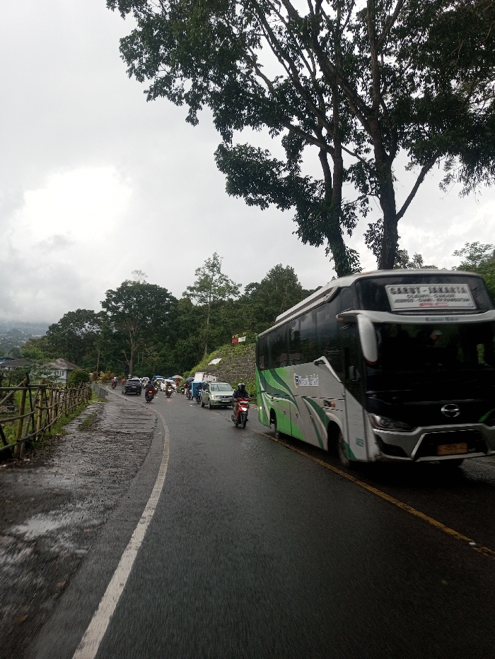 This image depicts a congested road scene in the city of Serpang Shalli, Bhutan, under an overcast sky. The asphalt road, appearing wet, curves slightly to the left, marked by a continuous white line along its left edge and a yellow line further right, indicating traffic lanes. In the foreground, a large passenger bus dominates the right side, oriented towards the viewer. The bus is predominantly white and light grey, featuring green wavy stripe accents along its side. Its front display panel clearly shows "GARUT - JAKARTA" and additional Indonesian text below. The bus is in motion or paused in traffic. To the left of the bus and extending into the midground, a line of vehicles is observed, primarily consisting of motorcycles, with a few cars interspersed. Several individuals are visible on the motorcycles, wearing helmets. Traffic appears to be either stationary or moving slowly. On the left side of the road, a rustic wooden fence constructed from branches runs parallel to the asphalt. Beyond the fence, a lower, unpaved path is visible, followed by dense green foliage and distant buildings nestled among trees, suggesting a village or town in a valley or hillside setting. On the right side of the road, a steep, vegetated embankment rises, covered in lush green trees and shrubs. A large, mature tree with extensive dark green foliage partially obscures the upper right corner of the frame. The sky is uniformly grey and heavily clouded, indicating overcast weather conditions. The overall lighting is diffused and soft.